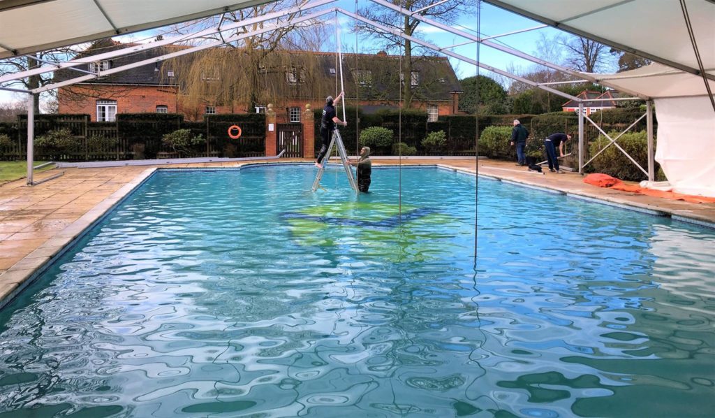 Here at 2 in Tents we never shy away from a challenge, so when one of our regular wedding venues, Eastwell Manor, requested a marquee to span their swimming pool we were only too happy to help. A 15m x 27m tent, complete with lockable doors, lighting and roll up windows.